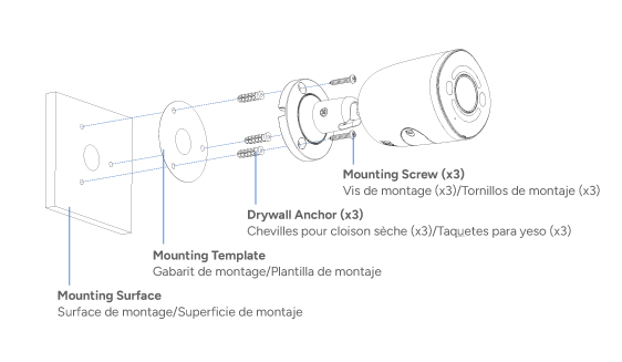- Use the mounting template to drill holes for screws, then insert the drywall anchors. Drill a hole for your camera’s cable if you plan to run it through the mounting surface.