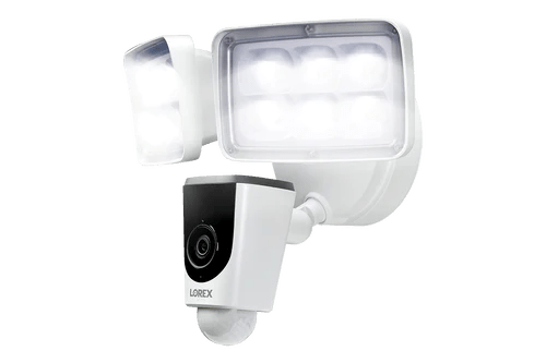 The camera is equipped with dual LED floodlights, two-way talk, and a deterrence siren to stop potential events before they happen.
