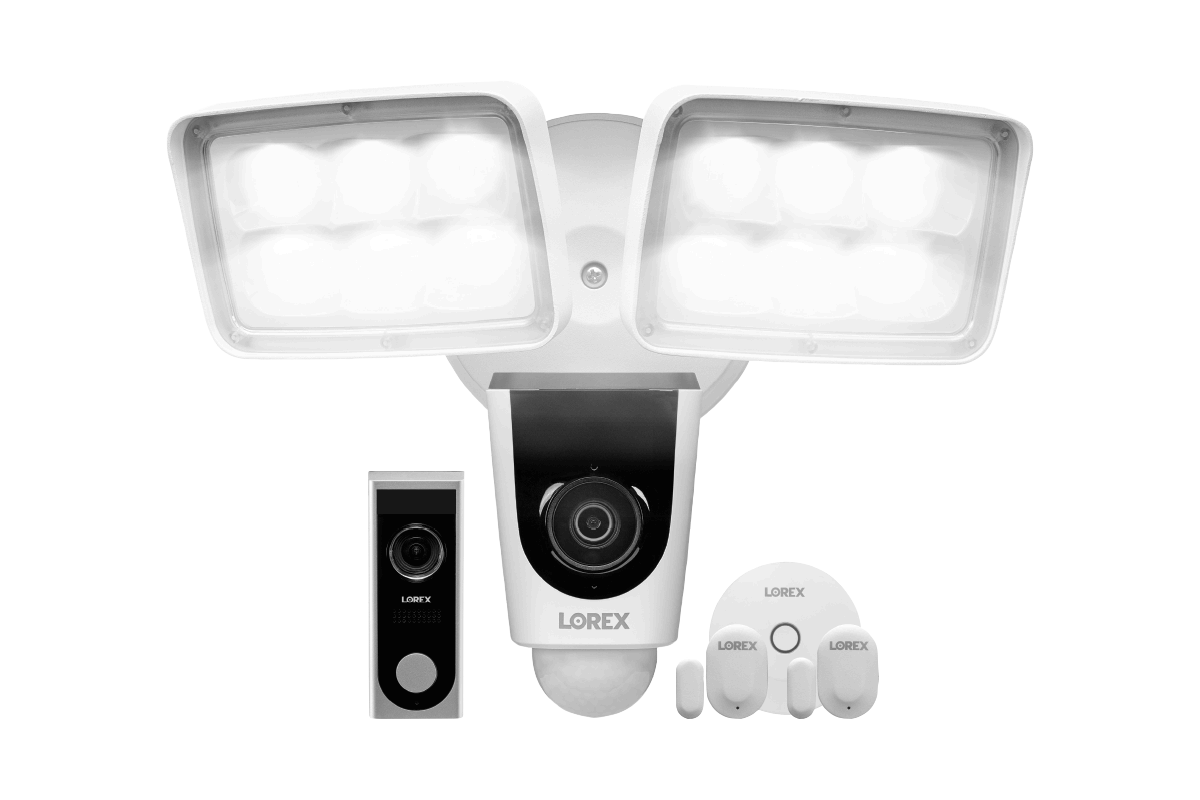 Safeguard your home - inside and out - with this Lorex Monitoring Kit. It includes a Wired Video Doorbell, a Floodlight Security Camera, and a Sensor Hub with two Window / Door Motion Sensors. All united under the Lorex app, this kit delivers mobile convenience and smart security monitoring with no monthly fees.