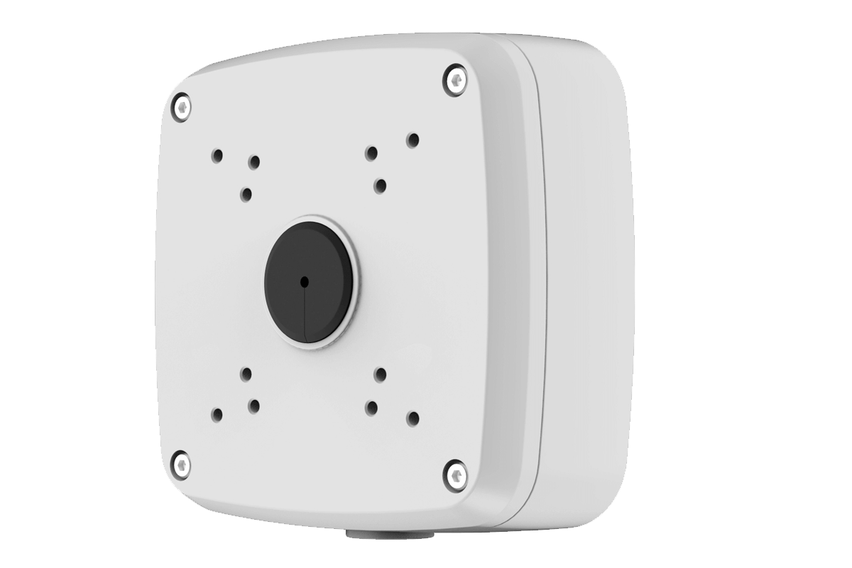 This weatherproof security mounting junction box allows you to conveniently hide your security camera cables from view and protect them from vandalism. It will also provide you with easier access to cabling connections without having to unmount your camera. This particular junction box has four sets of holes, 90° apart. Also available in black and gray.