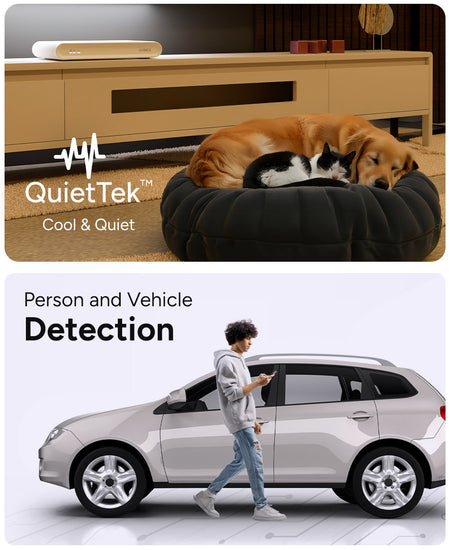 - Security without the noise – QuietTek™ technology allows placement near TVs and living areas