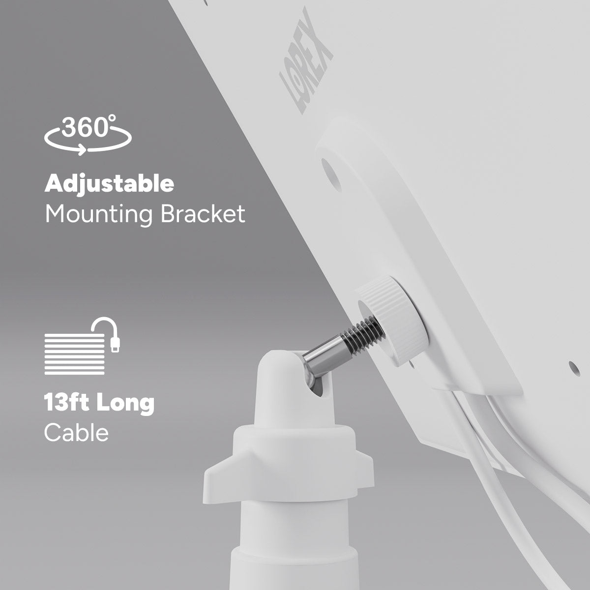 The adjustable mounting bracket and included 13 ft cable make positioning your solar panel simple and flexible, so you can capture the most sunlight no matter where your camera is installed.
